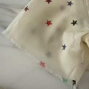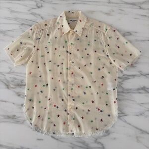 Authentic Saint Laurent Paris blouse, crafted in Italy, featuring an ivory semi-sheer lightweight fabric with multicolor star print throughout. Designed with a relaxed silhouette, short sleeves, spread collar, and raw/frayed hem detailing (intentional design). A collector’s piece that blends Parisian chic with playful edge.