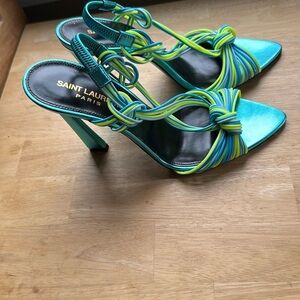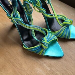 Elegant heels with a vibrant cerulean blue and lime twist. Ideal for a bold look, at home or on vacay!