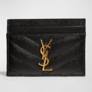 This Saint Laurent Premium Black Grained Card Case is a sophisticated accessory, offering elegance and utility. It’s textured leather and radiant gold YSL logo make it a distinguished choice.