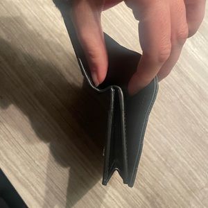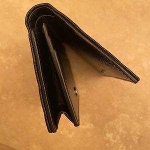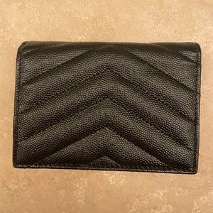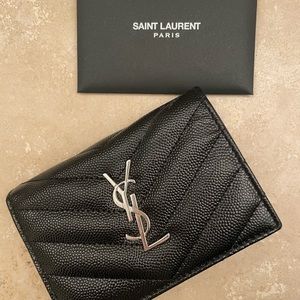 Chic black wallet with a quilted texture. Adorned with a silver YSL emblem. Perfect for stylish essentials.