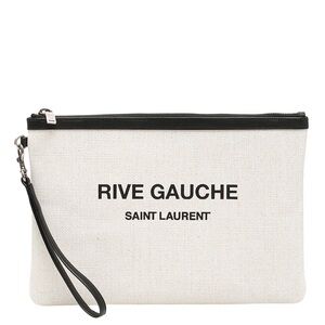 Saint Laurent clutch, YSL pouch, Rive Gauche bag, designer wristlet, canvas YSL, luxury clutch, minimalist designer bag, Parisian style, Saint Laurent beige pouch, authentic YSL