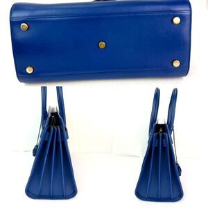 Delivery Duty Paid included – Pre-Owned 100% AuthenticSaint Laurent Sac De Jour Blue Leather Hand Bag RATING: C... Good, shows signs of regular use, item shows visible wearNO KEY NO STRAP MATERIAL: Calfskin leather HANDLE: double leather DROP: 4.5''COLOR: blue, royal blueCLOSURE: openEXTERIOR: has some wear of the blue on front pull tabs around edges, has faint indents and scuff on bottom ODOR: noHARDWARE: golden, has wear on zipper pulls INTERIOR: blue suede , middle zippered section, 2 open pockets on sides, has some faint marks, leather near top has some scuff marks (looks white) but cleanDATE CODE: FLY 355153*0714MEASUREMENTS: H 10'' x L 12.2'' x W 6'' across bottom INCLUDED: *YSL removable leather key bell with Lock(has protective coating)NO KEY NO Strap Please see all pictures to determine final condition, pictures are of actual item ! SHIPPING: will ship same day or next day SKU C571 0925 Measurments: strap length: 0 mm handle drop: 0 mm