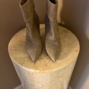 Classic suede pointed toe, pull on stiletto bootie with folded edge. Excellent condition with minor signs of wear