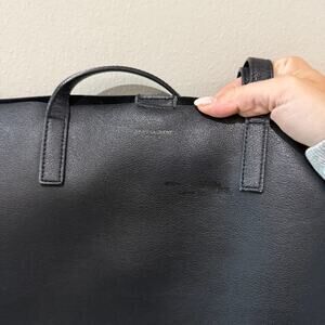 Saint Laurent Shopping Bag East West Tote in Smooth Leather Black. Features cassandre charm, leather lining, gold toned hardware, magnetic snap tab, detachable zipped purse, double handle, made in Italy. 96% calfskin leather, 4% polyurethane. Minor residue on exterior and handles and wear on corners. Retail $1,500.