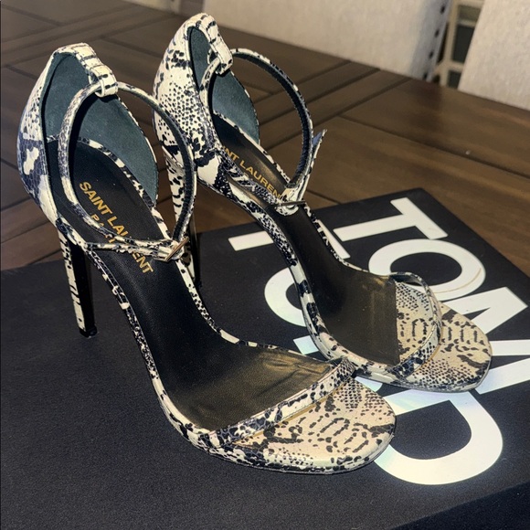 Chic Saint Laurent heels with a striking snakeskin design. Perfect for adding elegance to any outfit.