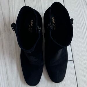 These adorable Saint Laurent booties have a 70mm heel (so comfortable with just enough lift) and a fun side fringe detail. Black suede with some wear on the bottom and front of toe. Overall excellent condition. Size 39, fits true to size (size 9). Inside zipper closure for easy on and off. Super soft suede material. No major flaws but these are previously loved, so worn on the bottom. Authentic, purchased from Neiman Marcus. No original box and no dust covers, but I will ship them in a box and I can provide Saint Laurent dust covers if desired (from another shoe, so they won’t be the original ones but will be authentic). Lmk if you have questions!
