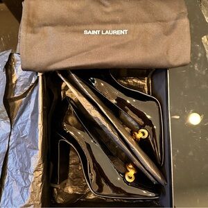 These heels are truly beautiful and very comfortable! They are a type of patent leather from Saint Laurent and they have a beautiful gold chain on the front! They have a black leather glossy finish chain-link detailing gold-tone hardware, square toe, branded leather insole, 110mm heel, and a slip-on style! They are made in Italy with Lining: Leather 100%; Sole: Leather 100%; Outer: Leather 100%. They sadly have a few minor scratches around some areas of the heels, but they are unnoticeable when wearing! They also have slight wear and tear on the soles but that is also unnoticeable! They also come with two duffel bags and a box!