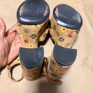 Chic Saint Laurent heels with floral design. Tan base with colorful accents. Perfect for stylish outings.