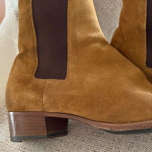 Chic unisex suede ankle boots by Saint Laurent. Features a stylish tan color. Size 41, men’s size 8 women’s size 10-101/2.Perfect for versatile wear. There is some wear and marks as shown in the photos. They are stylish with a stretch band on both sides for easy on and off. The boots include the dust bags, but the original box is not available.Please look closely at the closeup photos to see the marks I referred to.