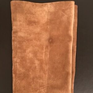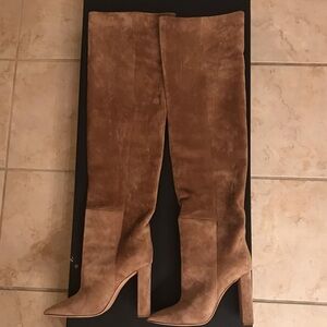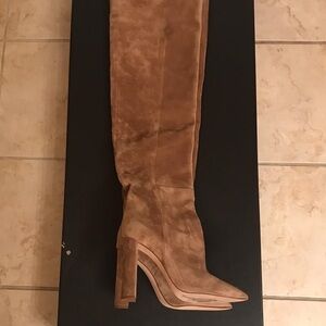 Saint Laurent Tanger boot is an over the knee design. Crafted from slouchy suede and shaped with a block heel and pointed toe. Pull on/slip on style. Black leather lining and insole. Small stain on right boot (refer to 3rd pic); not noticeable when slouched. Signs of wear on inner lining of boot from “pulling on” and some minor scratches on boot-please look at all pics. Comes with dust bags and extra heel tips. Size 39