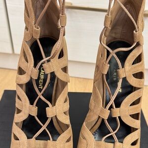 Elegant tan heels with lace-up design. Perfect for any occasion. Signature Saint Laurent style.