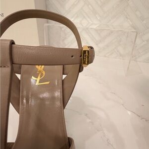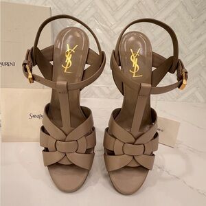 Brand new with tags Saint Laurent Tribute 75 platform sandals in dark beige leather.