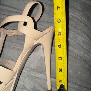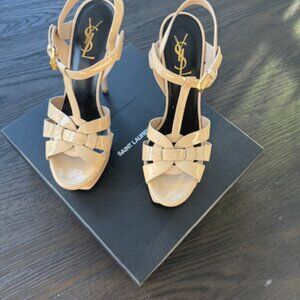 Sait Laurent Tribute 75 Nude Patent Leather platform high heel sandals. These are in great condition with minimal wear.