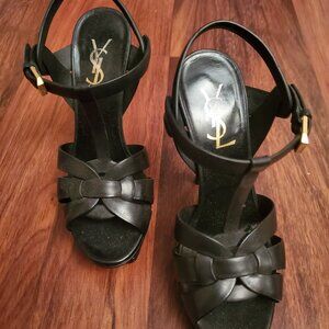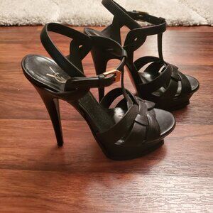 High heel stiletto sandals with intertwining straps made with metal-free tanned leather, worn once, great condition, featuring a beveled platform, covered heel and adjustable ankle strap engraved with Saint Laurent Paris.