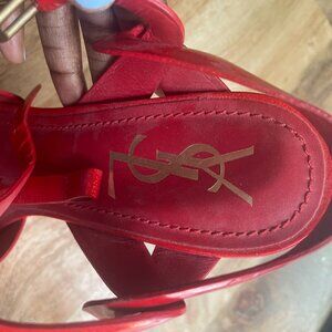 Worn only a few times, in great condition. Soles shown in pictures. Red-orange patent leather