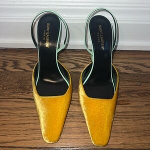 Luxurious velvet heels with a mint slingback. Perfect for a chic look.