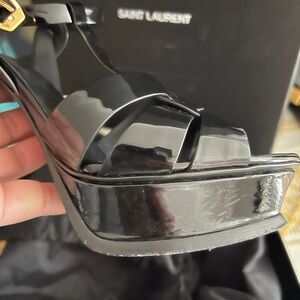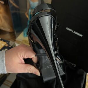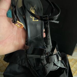 Chic Saint Laurent heels with a glossy finish. Strappy design with a sleek silhouette. Perfect for elevating any outfit. 100% authentic