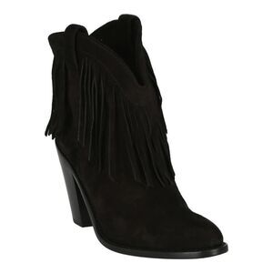 Delivery Duty Paid included – Heel height: 3.5"; Slips on; 100% Calfskin Suede; Pointed Toe; Western-inspired design with suede fringe around ankle;