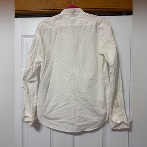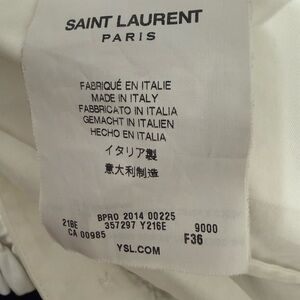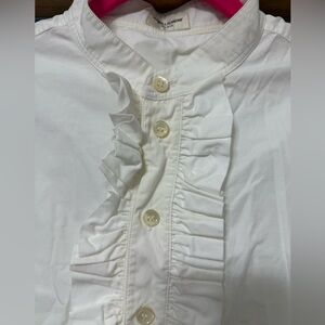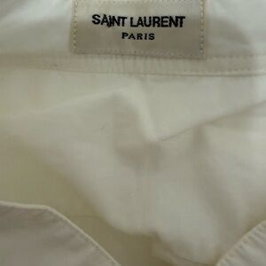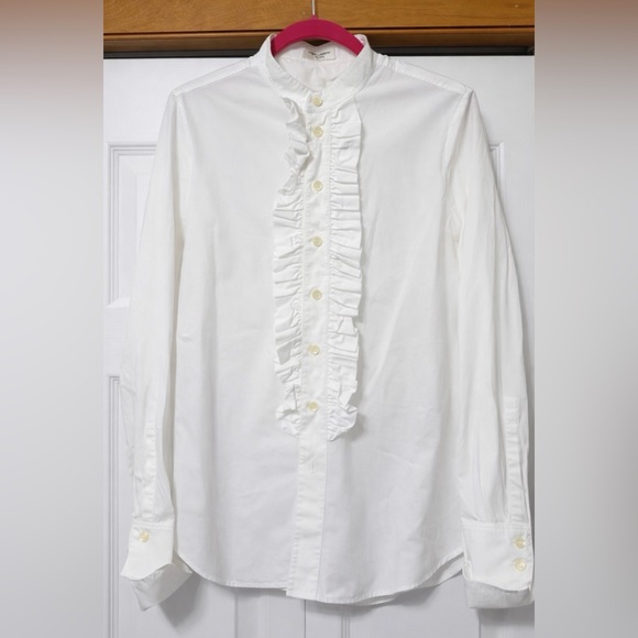 Elegant and timeless Saint Laurent Paris button-down shirt featuring beautiful front ruffle (frill) detail and classic tailored silhouette. This designer blouse offers a sophisticated feminine look perfect for office, formal events, or elevated everyday style.
