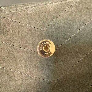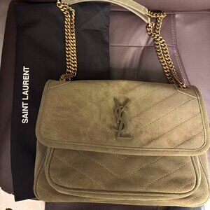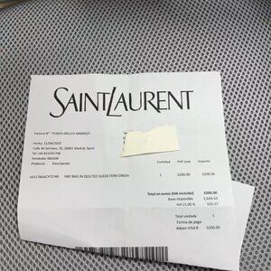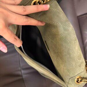 Hello! I'm selling this gorgeous Saint Laurent Niki quilted suede bag in an elegant fern green 🌿. The bag is in almost new condition, having been used very little! 🤩 It comes with its original dust bag 🌟. The dimensions are approximately 28 x 20 x 8 cm💼 Please note that the invoice shown in the picture will not be sent together because it contains my personal information.!!