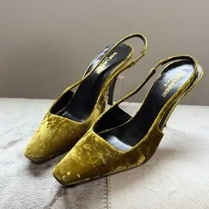 Chic velvet slingback heels by Saint Laurent. Mustard color adds a unique touch. Perfect for stylish outings.