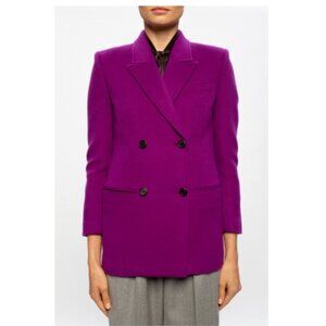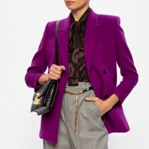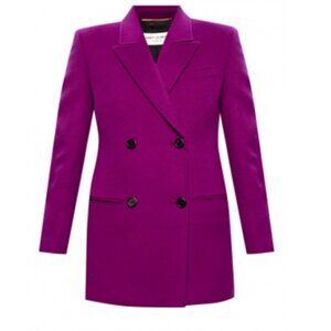 Purple/magenta blazer with notch lapels from Saint Laurent. Crafted from wool, this garment fastens with buttons and features three front pockets. Never worn condition.