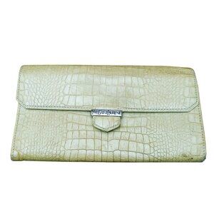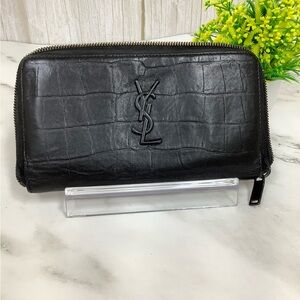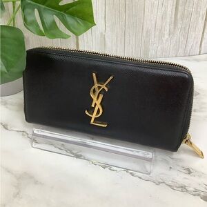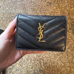 Classic Saint Laurent Paris black quilted envelope wallet with iconic gold YSL logo. Features chevron and diamond stitching, snap flap closure, center zip coin pouch, and multiple card and cash compartments. Timeless and elegant everyday luxury piece.