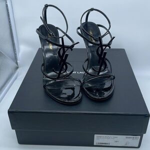 Saint Laurent YSL black on black cassandra strappy heels patent leather 38.5
