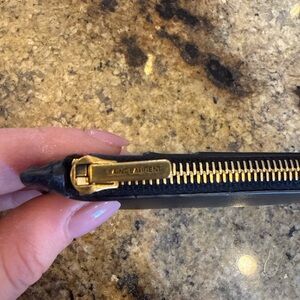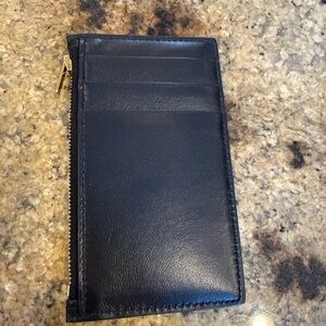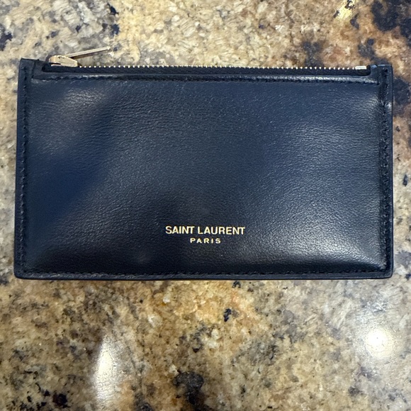 Authentic Saint Laurent leather zip card holder in classic black with gold-tone hardware and logo.