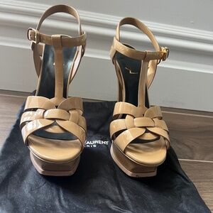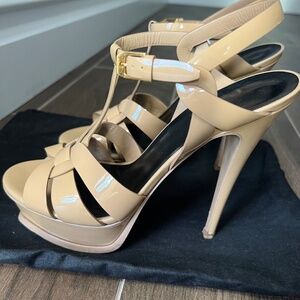 YSL patent leather Tribute sandal Dark Beige with gold hardware . 5.5” heel with 1” platform. Comes with dust bag. Good condition.