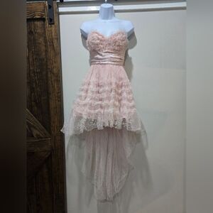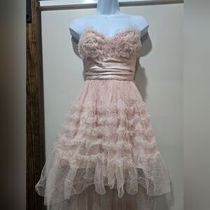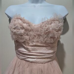 This fall 2015 Runway. Blush pink Saint Laurent strapless tulle dress featuring sweetheart neck, boning at interior waist, metallic trim at waist, high-low hem and concealed zip closure at side.