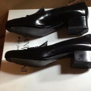Saint Laurent black low vamp tassel loafer. Shoes have a 45mm block heel. Almost no previous wear with front and back shoe taps attached to prevent wear.