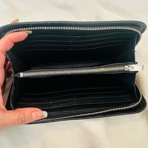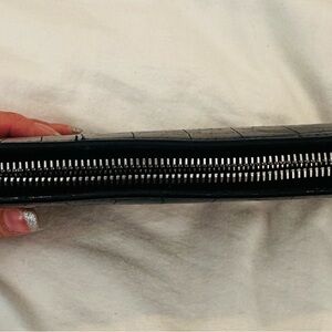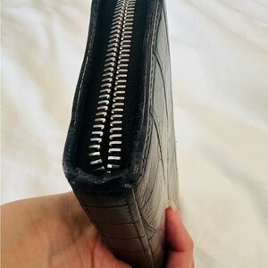 EUC-SAINT LAURENT- Black Croc Embossed Leather Zip Around Wallet. Six card slots on both sides and additional space for money with separate change zipper. Both zippers fully work. Some rubbing on leather to corners and edges please refer to all pics.