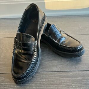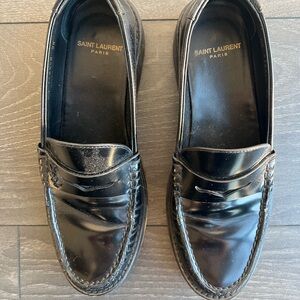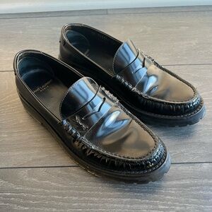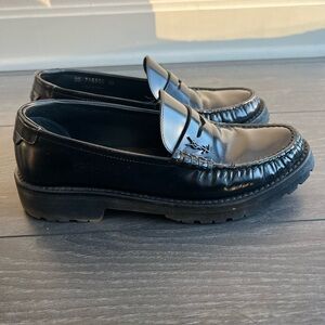 Sleek black loafers with a polished finish. Ideal for versatile wear. Designed for elegance and comfort. *Slightly dusty from storage, but easily cleanable and can look like new with a wipe and shine.