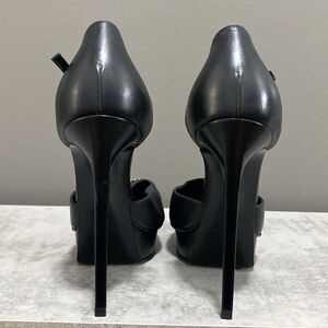 Step into elegance with these Saint Laurent black heels, featuring a striking stiletto design and edgy studded embellishments. The platform sole adds height and comfort, while the ankle strap ensures a secure fit. Perfect for making a bold statement at any event.