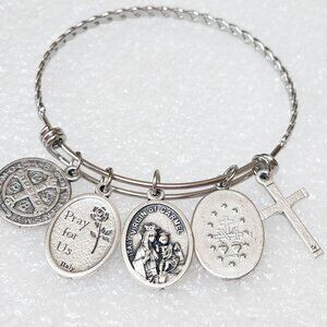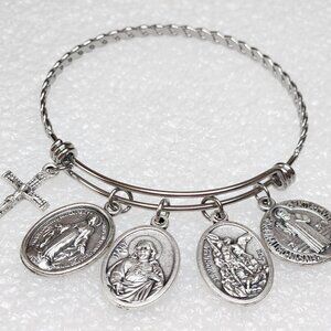 * Material: Stainless steel bangle. Medals & Crucifix: Die-cast for exceptional detail with a silver oxidized finish (each measures approx. 7/8" in height)