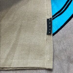 This tan cardigan sweater features a classic knit design with ribbed details, offering a timeless and versatile look. The long sleeves and button-front closure make it a perfect choice for layering in cooler weather. Its polo-style collar adds a touch of formality, making it suitable for both casual and dressy occasions.