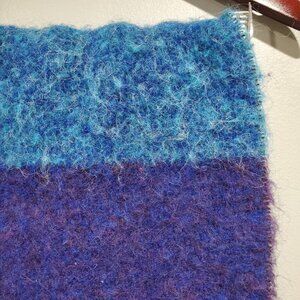 Saint + Sofia Hand Woven Wool And Mohair Scarf Blue Pink Purple Fringe 14"x70". Please note there is no material tag. From my reasearch I believe it is a mohair and wool fabric blend, but I am not 100% sure. The 70 inch length does not include the end fringe.