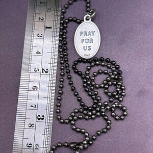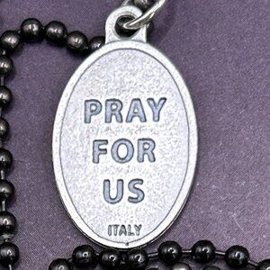 Heavier weight vintage silver tone or plated marked Italy religious medal necklace. Medal is vintage, shows wear and age. Chain is high quality all steel in dark gunmetal color and approximately 24 inches end to end. Ball joint clasp.