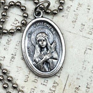 Saint St Philomena Italy Religious Medal Steel Chain Charm Necklace with Cloth Relic on Reverse