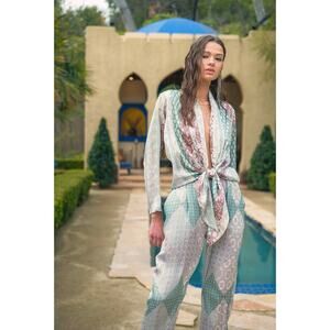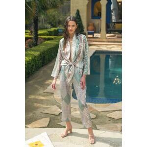 Step into luxury with our Saint-Tropez Satin Jumpsuit in a stunning multi-color sage print. This jumpsuit features a plunging self-tie neckline, long sleeves, and a pleated high-waist that accentuates your figure. The elastic waistband ensures a comfortable fit, while the hip side pockets add a touch of functionality to this glamorous piece. Make a statement and turn heads wherever you go with this eye-catching jumpsuit that exudes elegance and style.