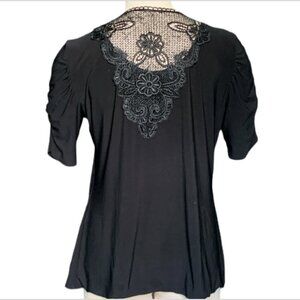 Saint Tropez West 2-Part Top features a mixed pattern of solid and floral designs with ruched sleeves and embroidered/crochet lace accents. It has a scoop neck and a pullover closure. This black blouse in size L is made of polyester spandex jersey knit fabric, suitable for casual or business occasions. The back showcases a rose design. Perfect for a neutral, BOHO, or black and white themed outfit with a touch of travel inspiration.