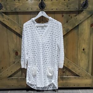 Stylish white hooded tunic featuring a V-neck and front pockets. Perfect for casual wear.