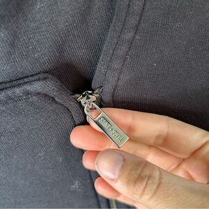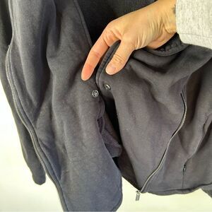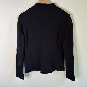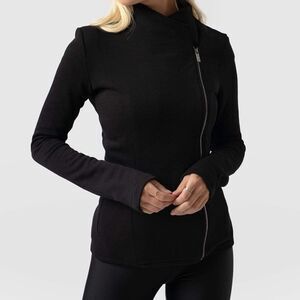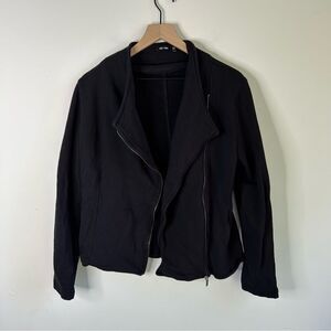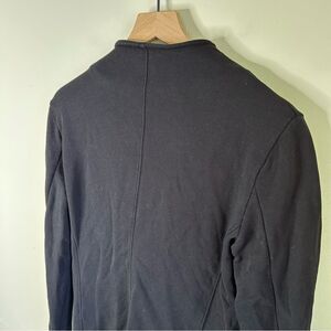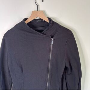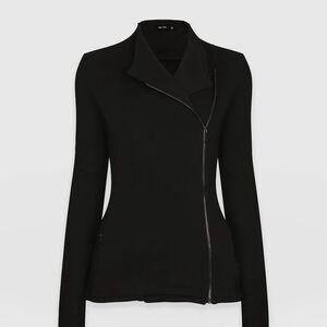 This sophisticated black blazer features an off-center diagonal zipper and a fitted silhouette, offering a modern twist on classic tailoring. Its minimalist design and structured collar make it a versatile piece for both casual and formal occasions.