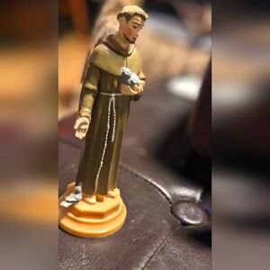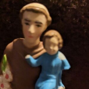 4 small figures of saints. 3 have magnetic bottoms one is not plastic the one green dress.