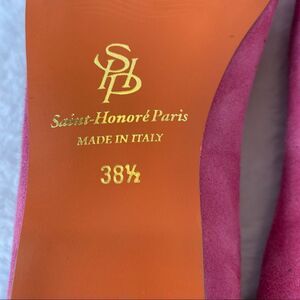 Saint-Honore' Paris Made In Italy Pink Suede Shoes Size 38.5. Great pre-owned condition. Slight heel of 0.75". Slight flaking along top trim. Front SHP in stones.