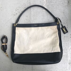 Canvas n leather, Please look at the pictures. One of the brass rings broke so I had them changed so that they would match. Shoeman lost the original one that was not broken. It’s leather. The canvas needs cleaning the bag itself has no damage. Measures approximately 16.5 x 13 x 3 handle drop is eight, has an adjustable detachable shoulder strap. Leather is Black