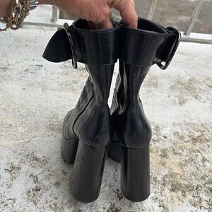 Check out the pictures. These are fantastic. The left heel has a neck, but the leather is not broken. The buckles need to be touched up,platform height is 2 inches heel height is 5 inches. Shaft height from the back of the heel is 7 inches, shaft width is 4 inches.