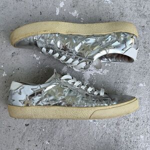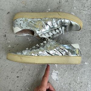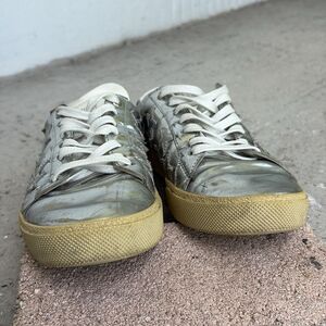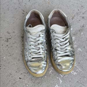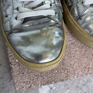 Please look at the pictures. The shoes themselves are not damaged, but they show signs of wear on the toes and on the inside. Maid in Italy.