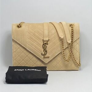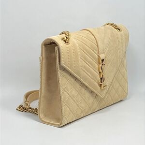 Dressed in a mixture of vertical, chevron, and diamond-quilted suede, this envelope bag is highlighted with polished YSL logo hardware and an adjustable chain strap.